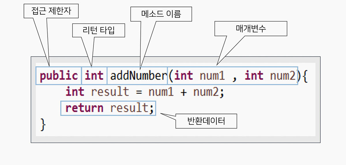 ▶ (int a, int b) : 메서드를 호출할 때 전달하는 입력 값을 정의 → 매개변수(parameter)