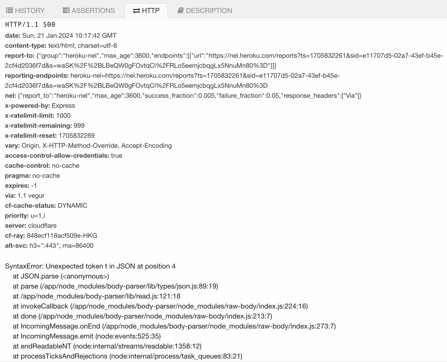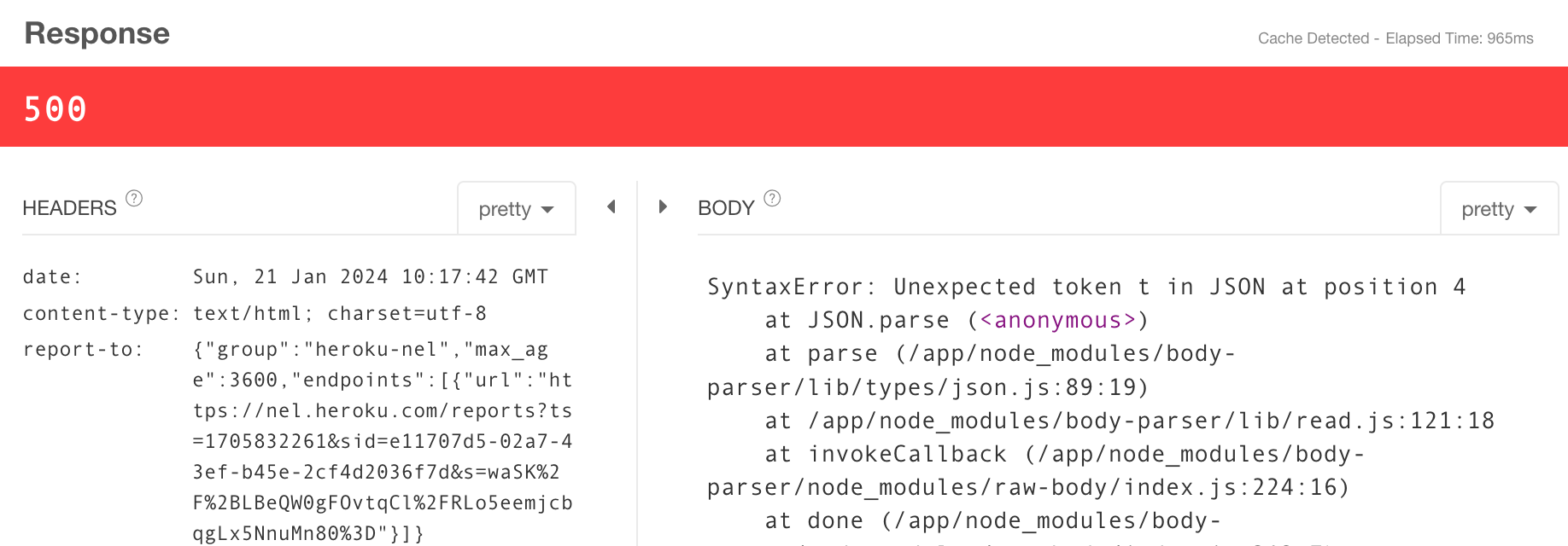 응답으로 500이 온다. 상태 코드 500은 서버 내부에 에러가 발생했다는 것을 의미한다. 응답의 BODY를 보면 'SyntaxError: ....'라고 나온다. 요청을 보낼 때 데이터를 잘못 보내면 다음과 같은 문제가 발생한다.
