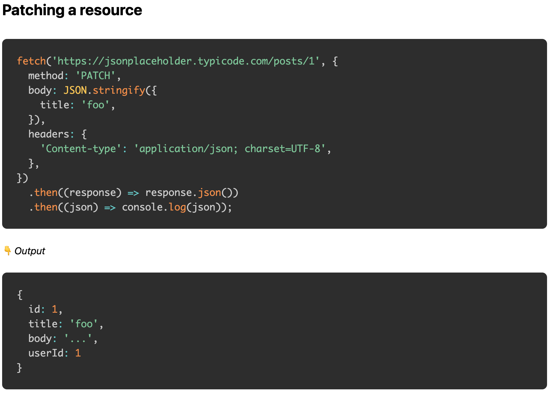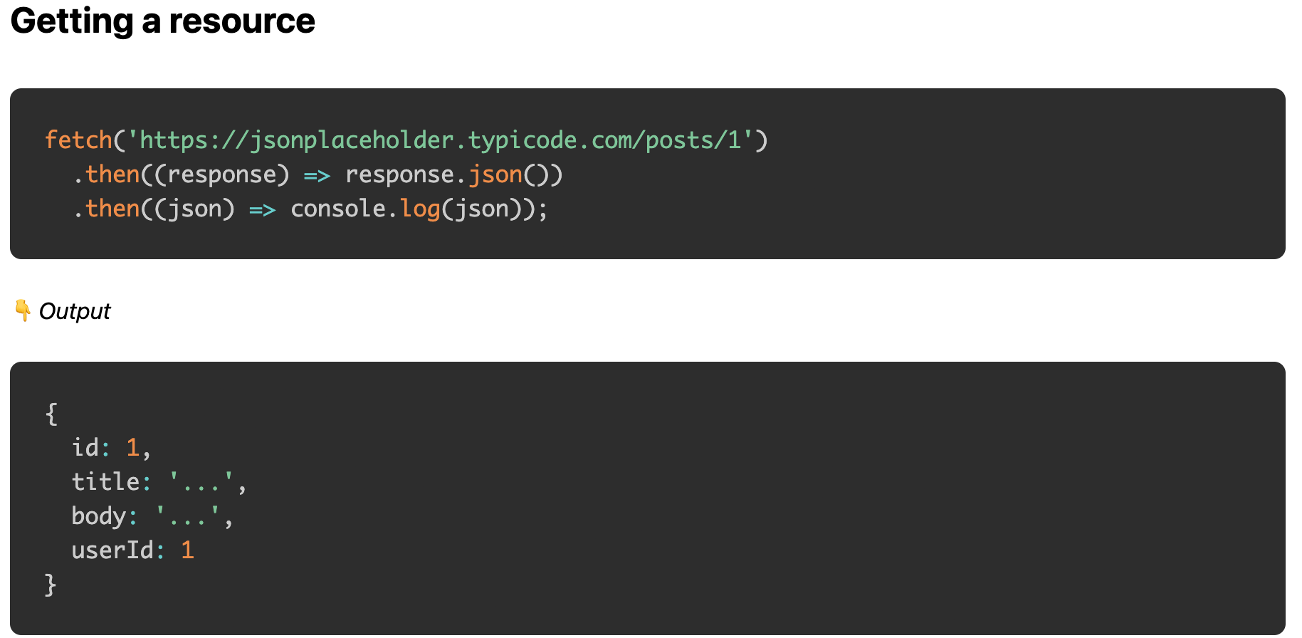 URL 경로를 확인해보면 .../post/1 이기에 1번 게시글을 조회하는 요청이다. 결과를 보면 1번 게시글의 id, title, body, userId가 JSON 데이터로 반환되었다. 그런데 데이터 조회를 요청할 때는 method 속성 값으로 GET을 써야 하지만 아래 코드에서는 GET을 볼 수가 없는데, 이는 GET은 method 속성의 기본값이기 때문에 이 경우에는 생략이 가능하기 때문이다.