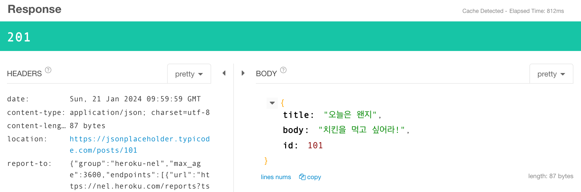 method의 속성 값이 POST이므로 데이터 생성 요청이다. 요청의 body 부분을 보면 JSON 데이터로 새 게시글의 title(제목), body(내용), userId(사용자 아이디) 값도 같이 보낸 것을 확인할 수 있다. 결과를 보면 요청 부분의 body 내용을 JSON 데이터로 그대로 반환한 것을 볼 수 있다.